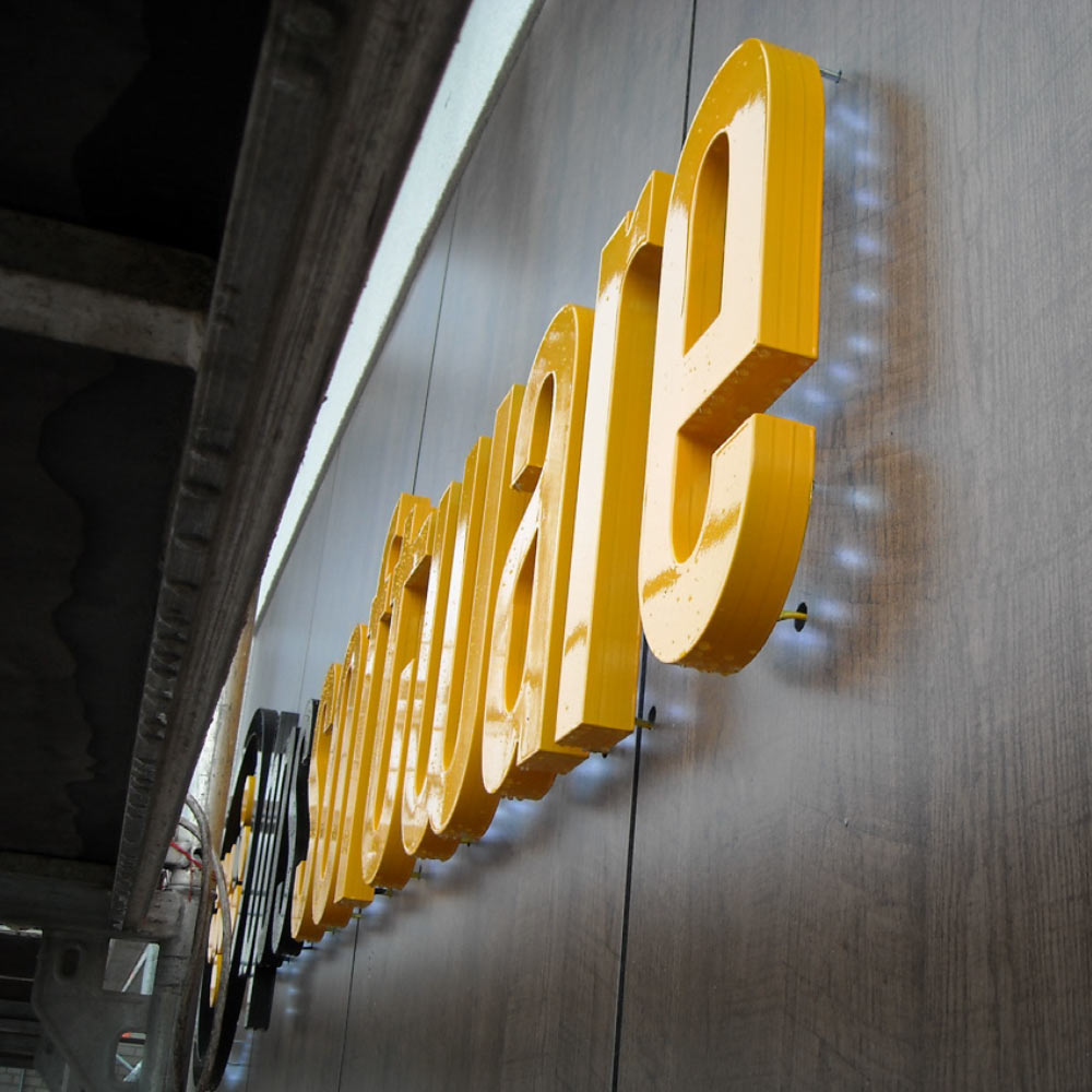 Zweiteiliger Vollreliefbuchstabe aus Aluminium. Pulverbeschichtet in Standardfarben bzw. lackiert nach RAL. Acrylglasboden für rückseitigen Lichtaustritt. Ausleuchtung mit innenliegenden LEDs indirekt auf dem Acrylglasboden. Standard-Bautiefe 70mm Oberteile aus Aluminium (lackiert nach RAL) Innen weiß grundiert Ausleuchtung: LED Indirekte Leuchtwirkung nach hinten durch das Acrylglas auf den Fassadenhintergrund Montage:Wandmontagemit Kabelschienemit Rahmenkonstruktion VorteileDezente, hochwertige Beschriftung z. B. für denkmalgeschützte Bereiche.Interessante, indirekte Ausleuchtung zur Fassade. Sonderlacke, Kalligrafien und Logos auf AnfrageSonderhöhen über 1000mm auf Anfrage