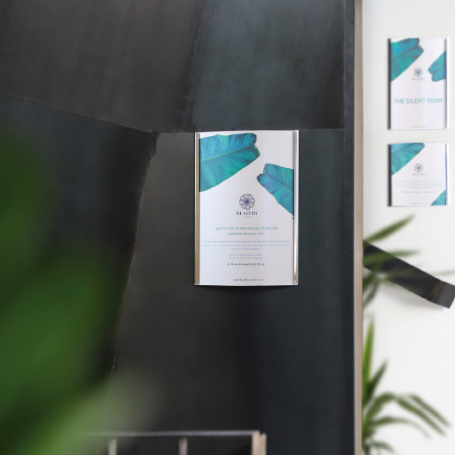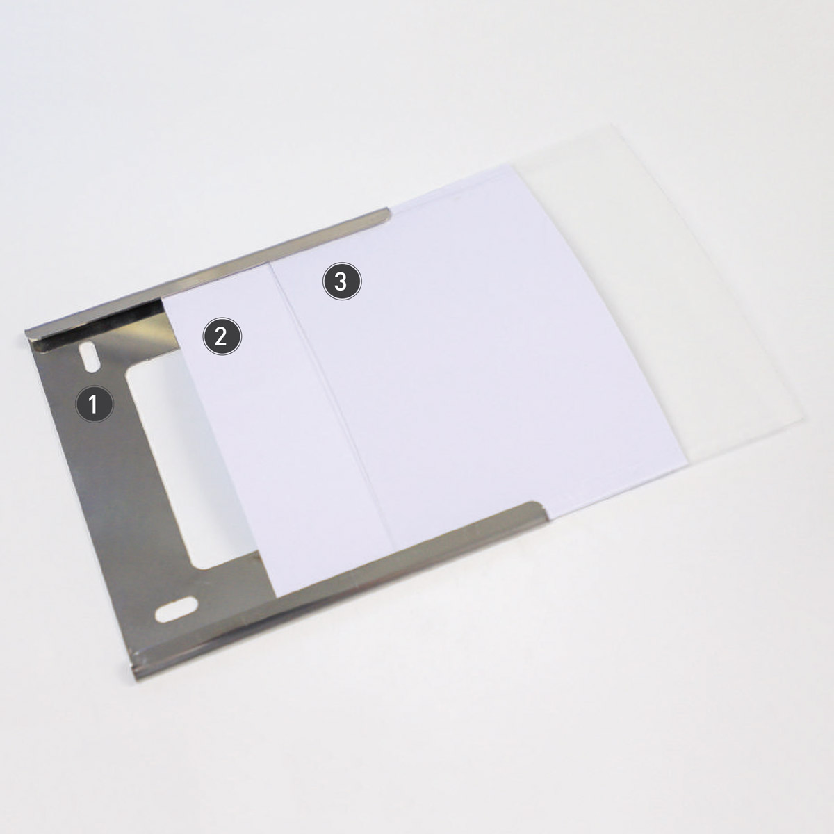Schnellwechselschild oder Inforahmen neu definiert: ein schlanker Rahmen hält durch die Materialspannung Ihre Information zwischen einer transparenten Abdeckung und einer weissen Rückwand.