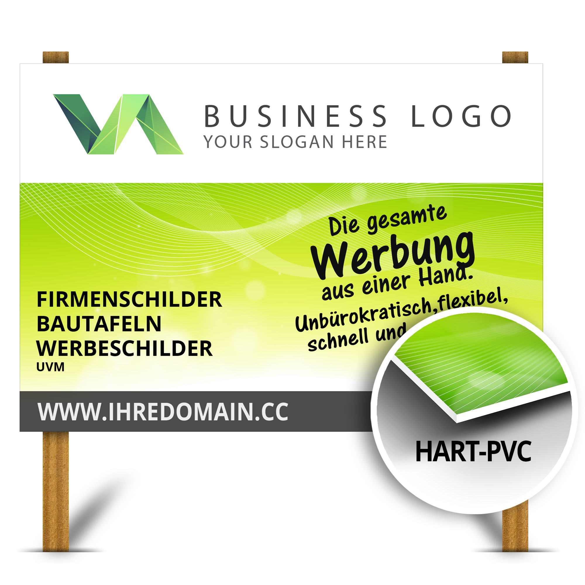 Direkt bedrucktes Hart-PVC-Werbeschild, optional auch mit beidseitigen Druck.