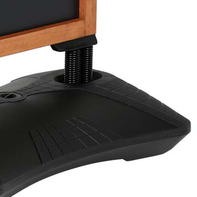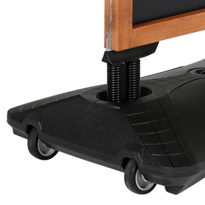 Kundenstopper mit schwarzer Metalltafel und Holzrahmen. Der Fuß ist aus Kunststoff und kann mit Wasser oder Sand befüllt werden. Bei Minusgraden mit Frostschutzmittel mischen. 2 integr. Rollen erleichtern den Transport. Einfache Montage.