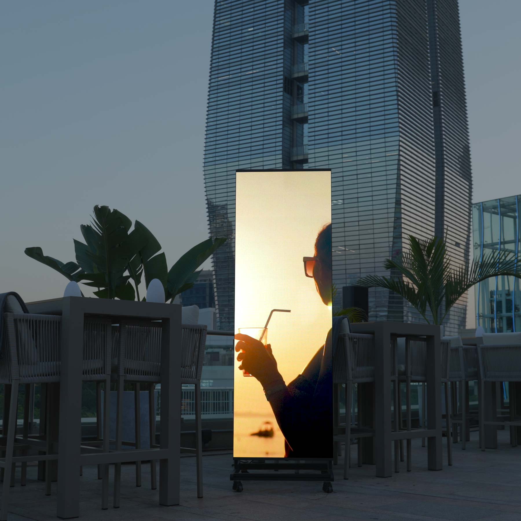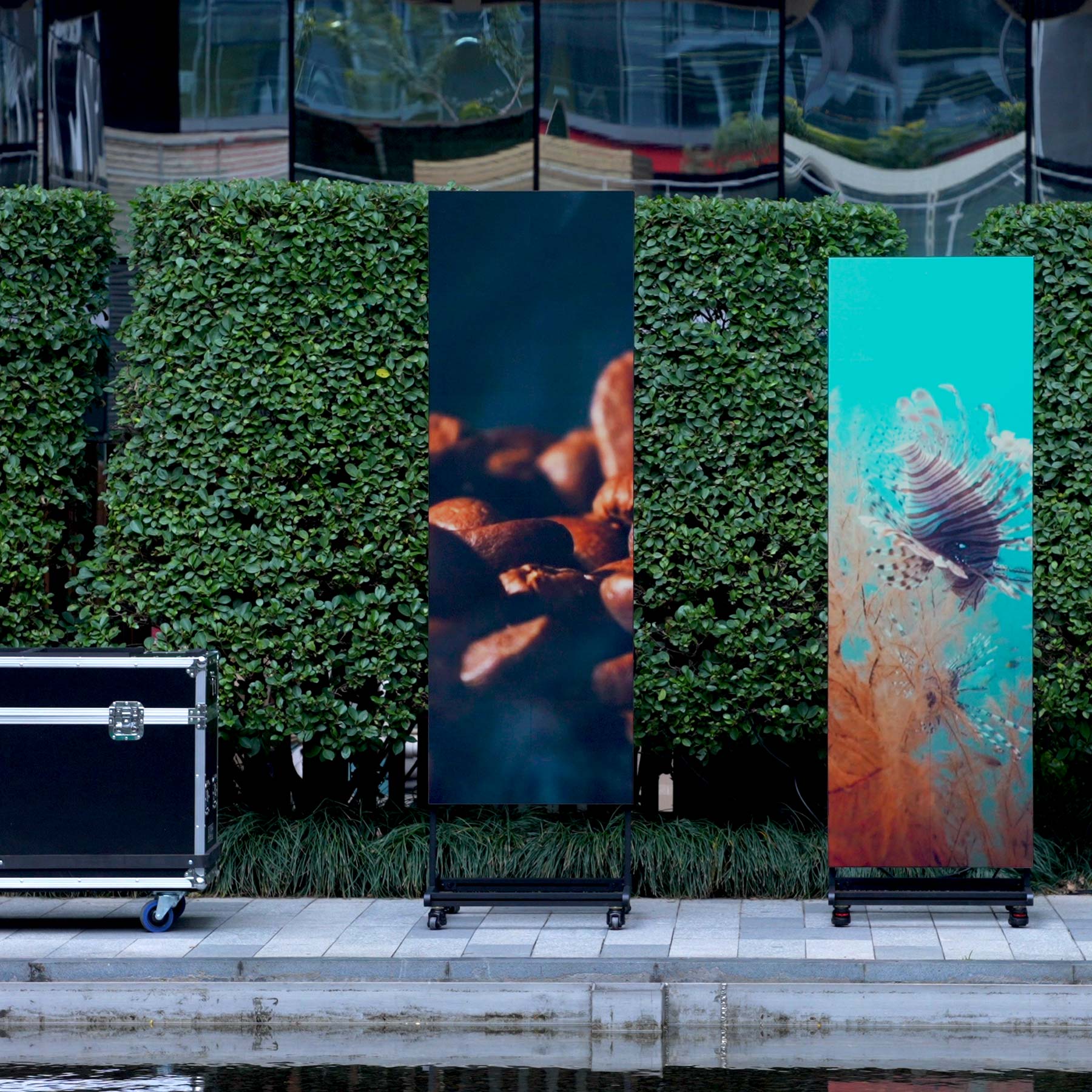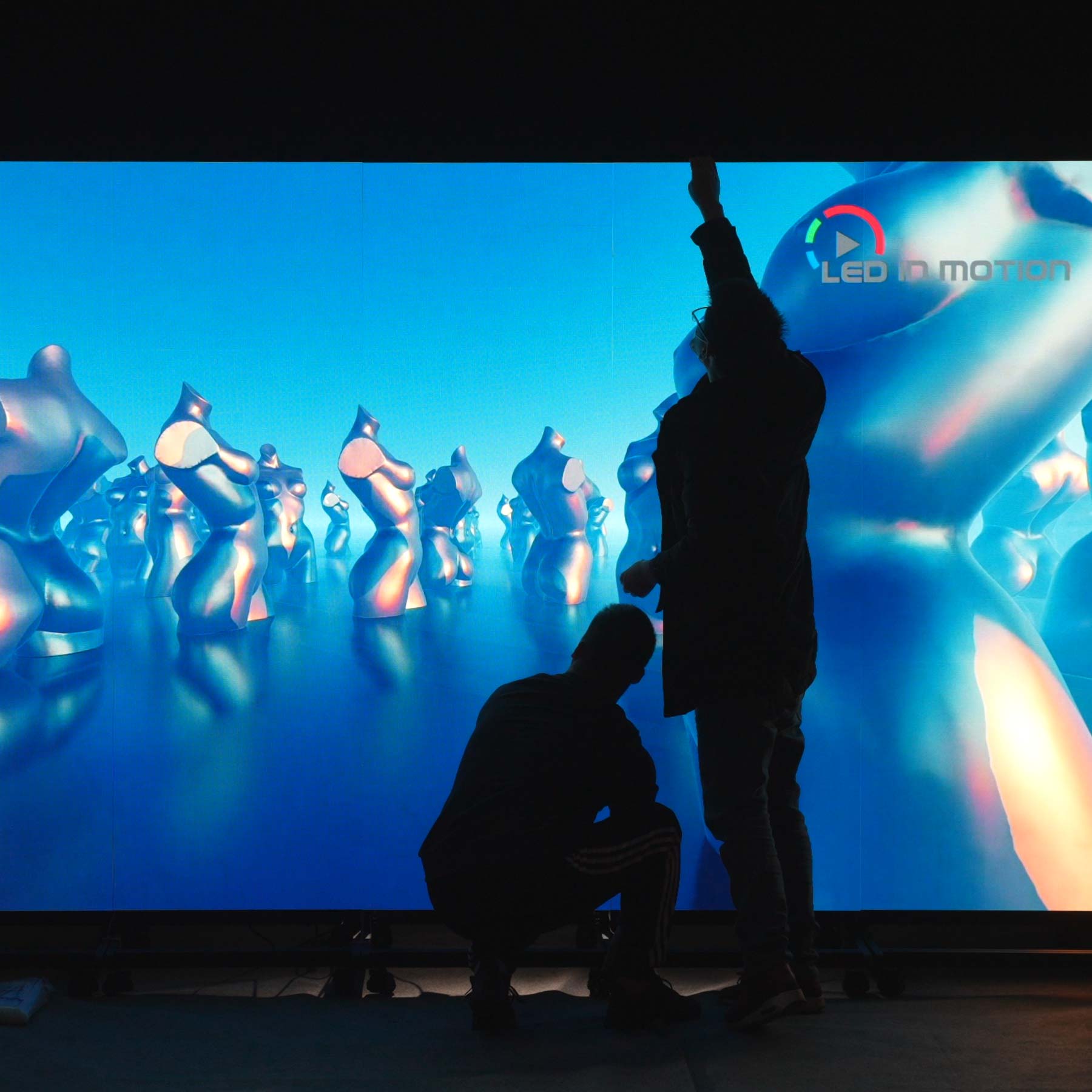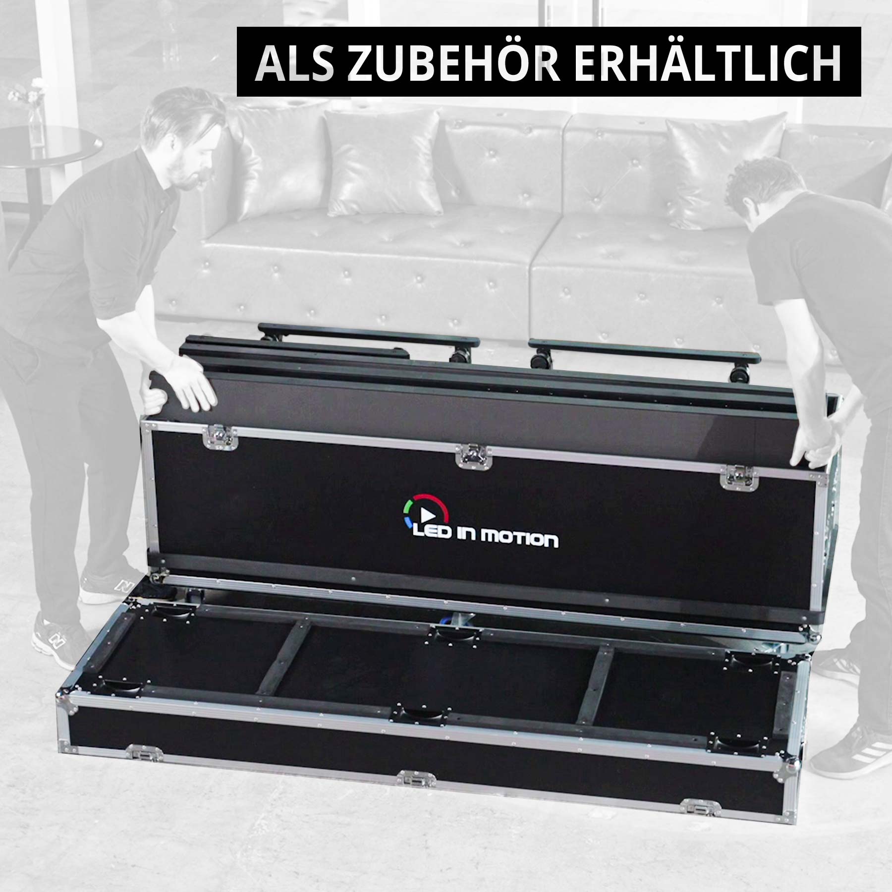 LED IN MOTION ist eine modulare Videowand. Die LED-Wand besteht aus einzelnen freistehenden Videodisplays. Diese Videomodule sind einzeln oder miteinander verbunden verwendbar. Es sind bis zu 16 Module koppelbar. 5 verbundene Module ergeben etwa das Format 16:9.