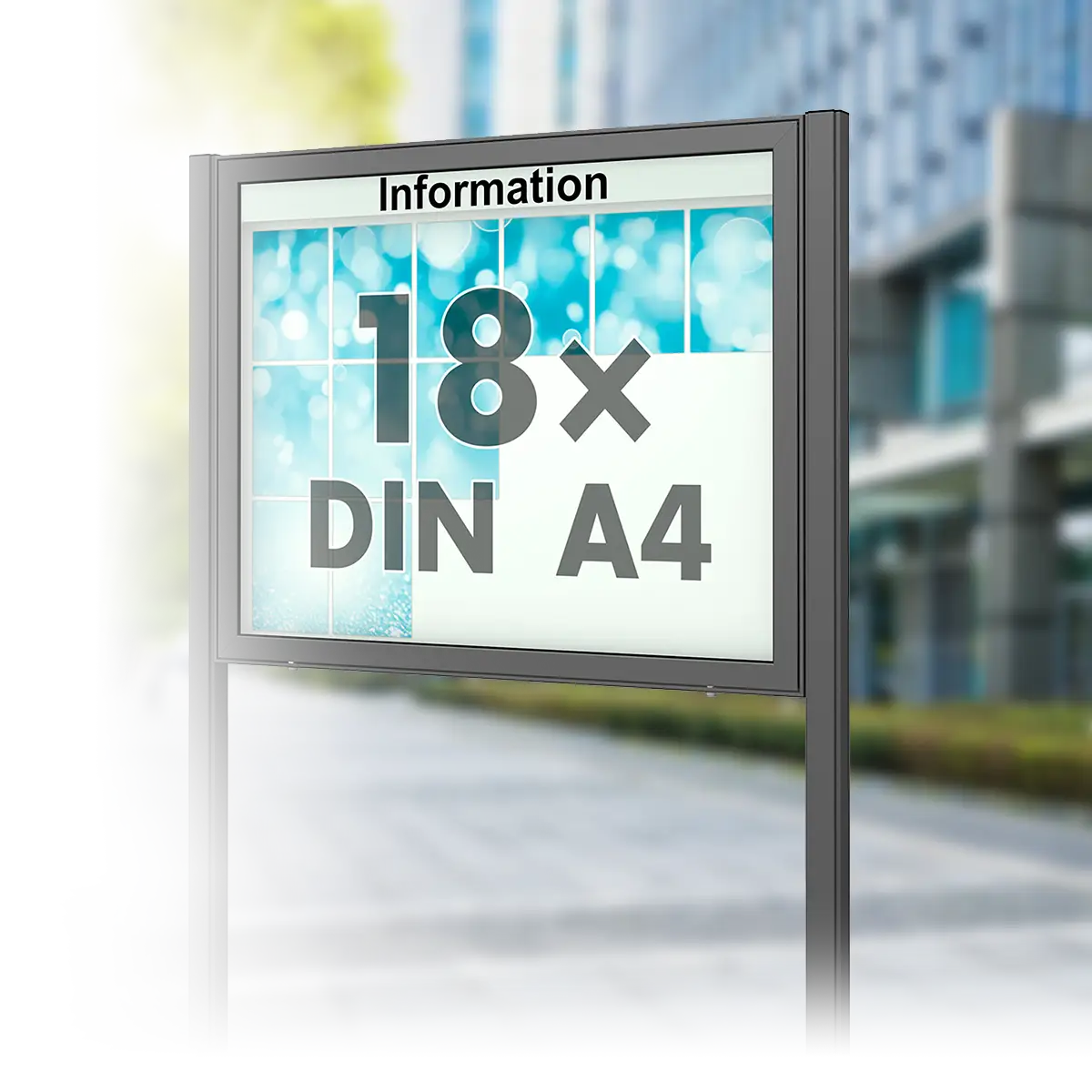 Wetterfestes Modell für großformatige Schaukästen im Außenbereich. Die Konstruktion aus stabilen Aluminium-Hohlkammerprofilen mit innen liegenden Eckverbindern geben diesem Schaukasten hohe Verwindungssteifigkeit und Stabilität. Geöffnet wird der Schaukasten per Klappflügel nach oben, unterstützt und sicher offen gehalten durch innen liegende Gasdruckfedern. Die Schließung erfolgt von unten über zwei Sicherheitsschlösser.Außenmaß: 980 x 830 x 65 mm (B x H x T) Sichtfläche: 850 x 610 mm | Nutzbare Innentiefe: 45 mm 18 DIN A4 Blätter können im Hochformat ausgehängt werden.  Freistehend mit zwei seitlichen ST-StandbeinenVerdeckt liegende Be- und Entlüftung gegen Beschlagen der Scheibe Günstiges Modell mit hervorragendem Preis-Leistungs-Verhältnis Absolut wetterfest, wartungsfrei und sicher abschließbarVorgesehen zur Einbetonierung in ein bauseitiges FundamentVorgesehen zur Verschraubung auf ein bauseitiges Fundamentauf Wunsch auch in allen RAL-Farben erhältlichNutzerinformationen